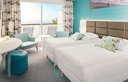 Nos 112 chambres (dont 4 chambres accessibles PMR : informations accessibilité ICI) se déclinent en différentes atmosphères : l'univers GRENAT est composé de bois blond, réhaussées de rouge et gris ; l'ambiance AQUAMARINE combine des nuances bleu-vert autour d'un mobilier ivoire.
