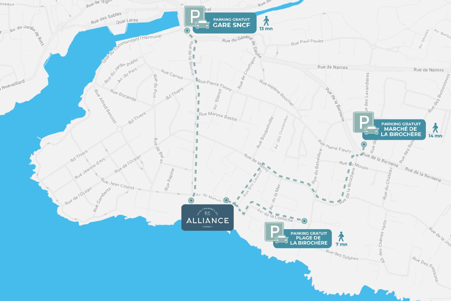Nous vous invitons à anticiper votre venue en prévoyant un stationnement dans les parkings publics situés à proximité. Plusieurs parkings gratuits sont accessibles à environ 10 à 15 minutes à pied de la Thalasso.