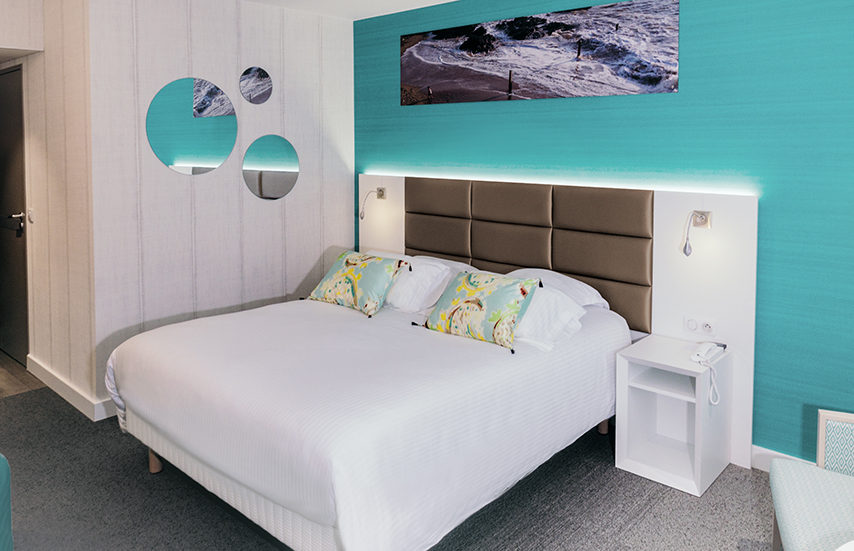 Nos 112 chambres (dont 4 chambres accessibles PMR : informations accessibilité ICI) se déclinent en différentes atmosphères : l'univers GRENAT est composé de bois blond, réhaussées de rouge et gris ; l'ambiance AQUAMARINE combine des nuances bleu-vert autour d'un mobilier ivoire.